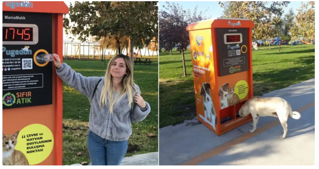 Në Stamboll, ky vizion është bërë realitet falë një kompanie inovative të quajtur Pugedon. Krijimi i tyre, i quajtur “Smart Recycling Box”, është një makineri që shpërndan ushqim dhe ujë për macet dhe qentë endacakë në këmbim të shisheve plastike të ricikluara.