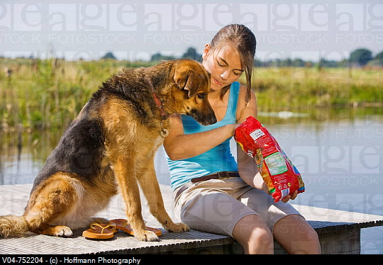 Teenaged girl and her pet dog eating potato chips outdoors at a lake