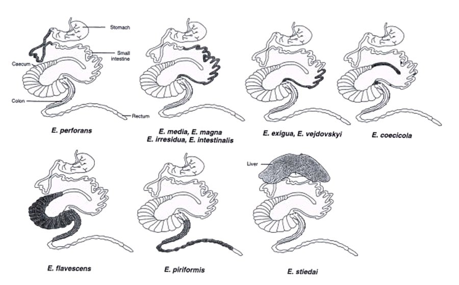 Eimeria perforanns paraziton në duoden, E.Media, E.magna, E.iresidua dhe E. intestinalis parazitojnë në zorrët e holla, veç duodenit, E. Exigua dhe E.Vejdovski parazitojnë në pjesën fundore të zorrëve të holla, E. Coecicola paraziton në pjesën kraniale të cekumit, E.Flavoscens paraziton në cekum dhe fillimin e kolonit, E.Piriformis paraziton në pjesën e fundit të kolonit dhe në zorrët e drejtë (rektum) dhe E. Stiedal paraziton në mëlçi. Të dhënat për vend parazitizmin e parazitëve të llojeve të ndryshëm paraqiten në Foton 1. Vendi i prekur është shënuar me të zezë.