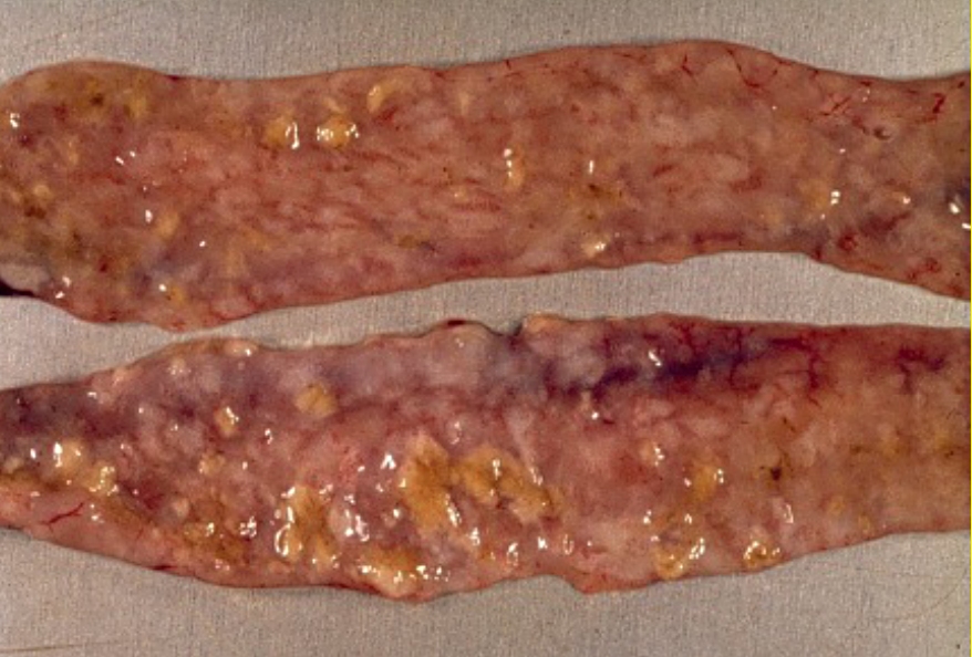 Sikurse paraqiten në foton 3, në mukozën e zorrëve ka vatra hemorragjike, të përhapura dhe pa ndonjë formë të përcaktuar. Në foto vërehen qartë vatrat nekrotike të përhapura, kurse në figurën sipër vatrat nekrotike janë më pak të shfaqura. Në të dy fotot vërehen nodula të ngritura që mund të jenë rezultat i prekjes dhe zmadhimit të nyjeve limfatike.