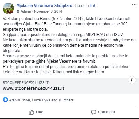 -Me mburrje dhe kënaqësi themi se postimet që janë bërë në facebook në grupin e mbyllur “Veterineret”, kanë shërbyer jo vetëm për të mësuar nga njëri-tjetri, por dhe kanë rënë këmbanave të para për sëmundjet serioze që ishin jo me pak pasoja për ekonominë bujqësore.