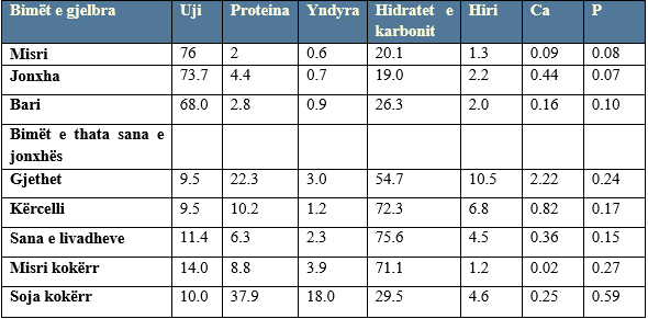 Uji – është përbërësi kryesor i organizmit bimor. Te disa bimë uji mundë gjendet në sasi deri 90 % të sasisë së përgjithshme (kungulli, pangjari, gjethet e panxhar sheqerit etj). Në shumicën e bimëve të gjelbra sasia e ujit sillet 60-80%( jonxha e gjelbër, tërfili, bari i gjelbër, kolza, lakra foragjere) etj. Bimët e thata voluminoze varësisht nga teknologjia përgatitjes përbëjnë 10-20 % ujë (sana, kashta, talla, rriskat e terura të panxhar sheqerit etj.). Sasia e ujit të bimët varet nga fenofaza e zhvillimi të bimës, me rritjen e moshës së bimës zvogëlohet sasia e ujit. Ushqimet e koncentruar varësisht nga mënyra përgatitjes së tyre përbëjnë 10-25 % ujë. Hidratet e karbonit – Përbërësi i dytë më i rëndësishëm i organizmit bimorë janë hidratet e karbonit. Varësisht nga lloji i bimës përqindja e hidrateve të karbonit në bimë sillet prej 30 -75%.