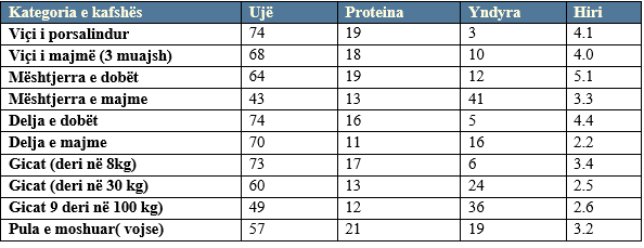 Uji – Sasia e ujit në organizmin e kafshëve varët nga lloji kategoria dhe mënyra e të ushqyerit, sasia e ujit në organizmin e kafshëve sillet prej 40-75%. Embrioni i viçit menjëherë pas formimit përmban mbi 95% ujë,viçi i porsalindur përmban diku 75% ujë, ndërsa te viçat në moshë 5-6 muaj sasia e ujit zvogëlohet në 65-70%,kurse te gjedhi i rritur sasia e ujit tregon variacione prej 40-60%. Zvogëlimi i sasisë së ujit në organizmin e kafshëve vjen me rritjen e moshës për arsye të rritjes së yndyrës në organizmin shtazorë. Ekziston korrelacion negativ në mesë të sasisë së ujit dh të yndyrës në organizmin e kafshëve.
