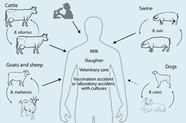 Bruceloza transmetohet tek njeriu nëpërmjet kontaktit direkt ose indirekt nga dhentë dhe dhitë (Brucela melitensis), nga gjedhi (Brucela abortus) dhe derrat (Brucela suis).