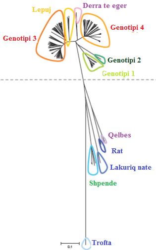 Skema tregon lidhjen midis genotipeve te ndryshme (per te gjithe Genotipet) si dhe brenda kesaj dhe te genotipeve 3 e 4, pergjegjes te patollogjise tek njerzit. Ne vazhdim te kesaj llogjike, virusi i Hepatitit E tek njerzit prek dhe kafshet, te cilat jane REZERVUARE. Me poshte paraqesim kafshet qe jane rezervuare te ketij virusi si me presence antitrupash ashtu dhe presence virusi. Keto te dhena flasin per rolin e kafsheve ne perhapjen e ketij virusi Zoonotik.