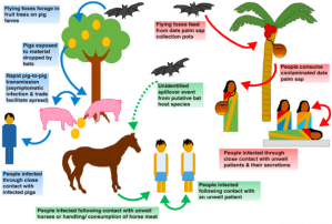 Nga shpërthimet në Bangladesh, konsumimi i frutave ose produkteve të frutave (p.sh. lëngu i palmës së papërpunuar) të kontaminuar me urinë ose pështymë nga lakuriqët e infektuar të frutave ishte burimi më i mundshëm i infeksionit.